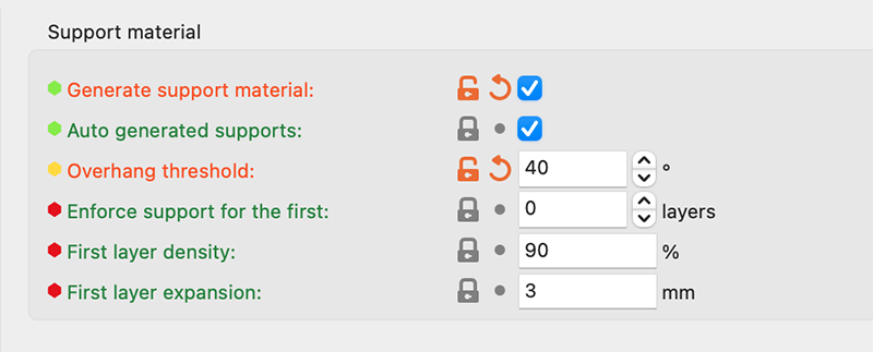 Notice that the chamfers on the edges of the parts do not need supports. To prevent the slicer from generating the unnecessary supports, you can adjust the overhang threshold to a value below 45. This is how it’s done in PrusaSlicer: